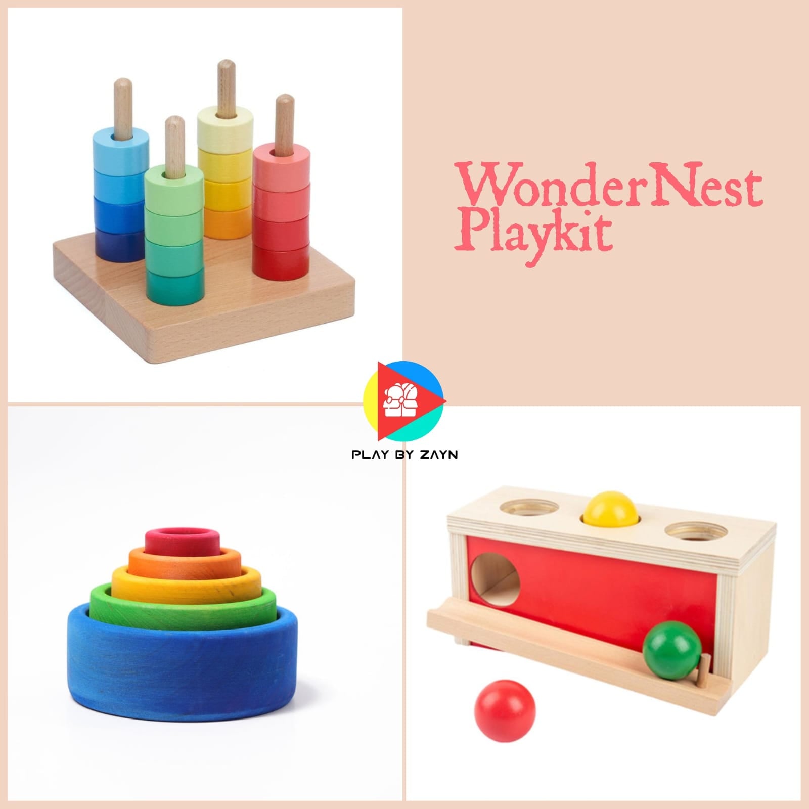 Introducing 'WonderNest PlayKit' – where curiosity meets creativity! Watch your little one explore the magic of object permanence with the ball push, master the art of nesting and stacking with vibrant rainbow bowls, and enhance motor skills with rainbow discs on four dowels. Unleash the joy of discovery for 18-21 month-olds!