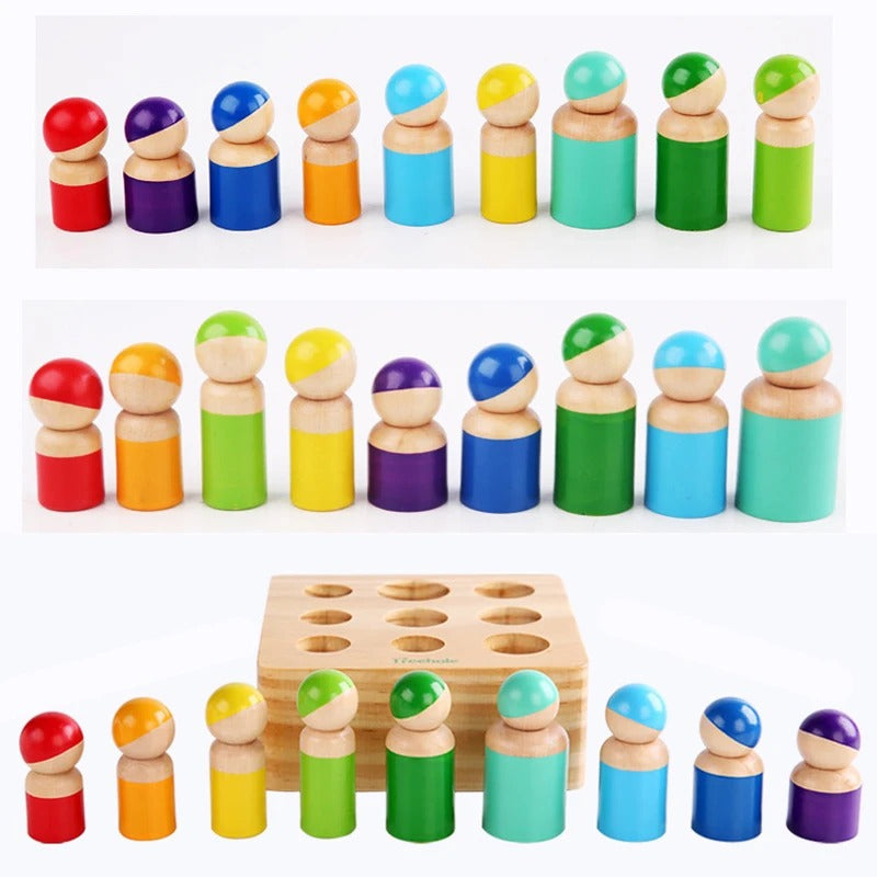 This Cylinder Socket Block consists of one wooden board with 9 sockets and nine (9) wooden figures with varying heights, girths, or colors. Each socket is capable of perfectly accommodating most of the figures at the same head level except for one.