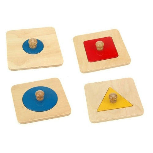 The set consists of four 1-piece puzzles: Large Circle, Small Circle, Square, and Equilateral Triangle.