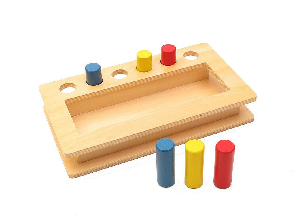 The set consists of a wooden tray and six wooden colored cylinders (2 blue, 2 red, 2 yellow). Helps your little one to develop hand-eye coordination and refine fine motor skills.