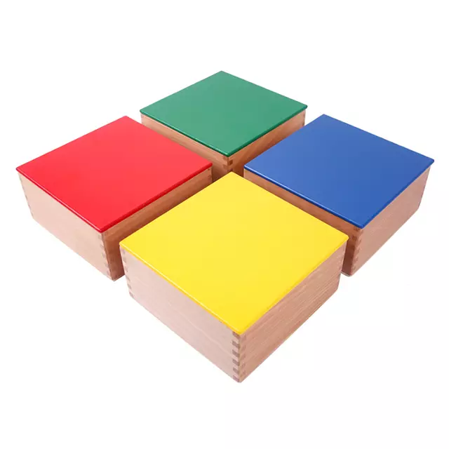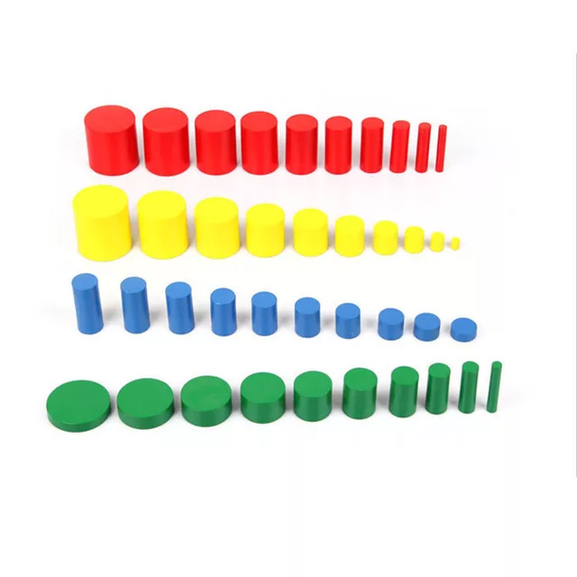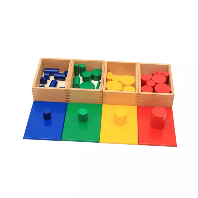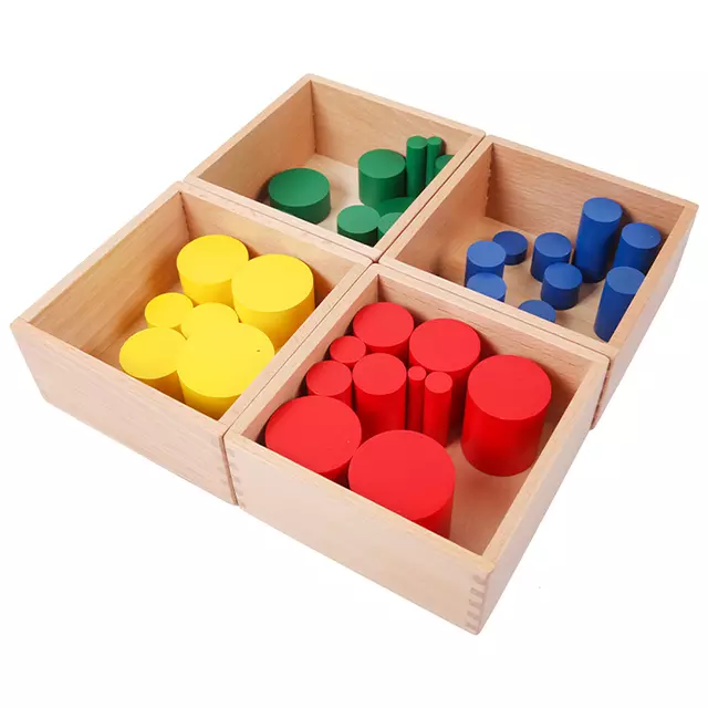 4 sets of 10 cylinders varying in height and/or diameter in each set. Each set is in a separate wood box with the lid painted the same color as the cylinders: red, green, yellow and blue.