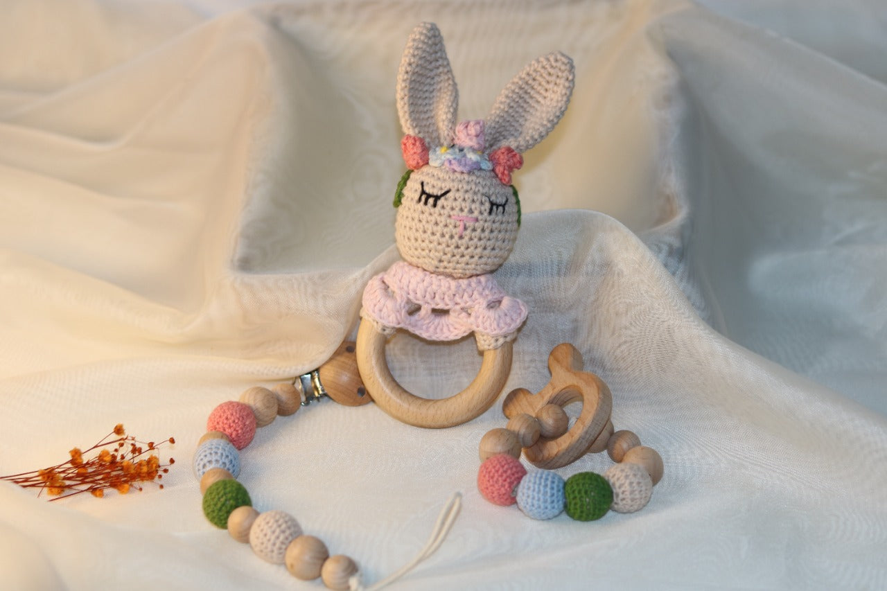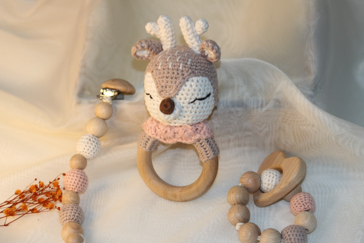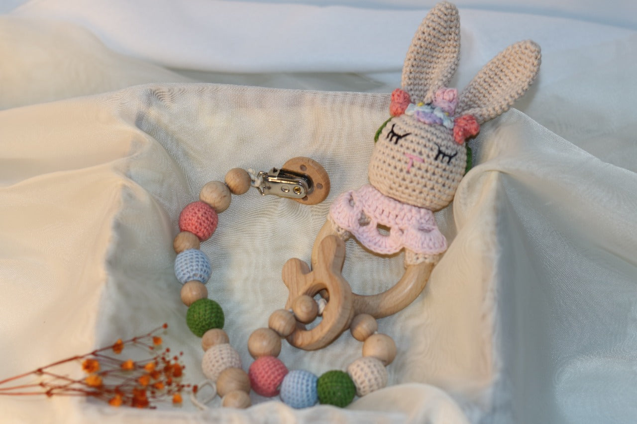 This lovely baby rattle set is is made from 100% cotton and beech wood, and consists of a: