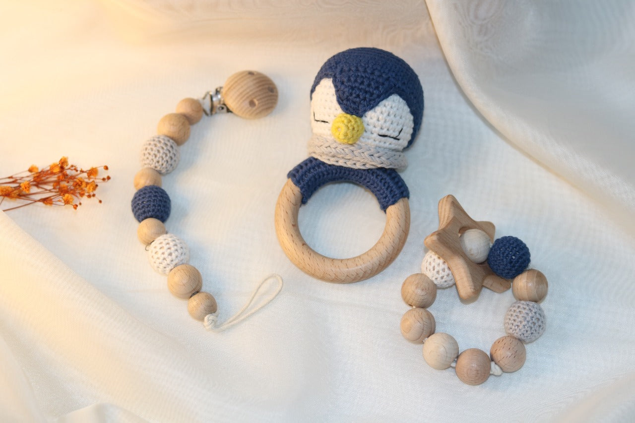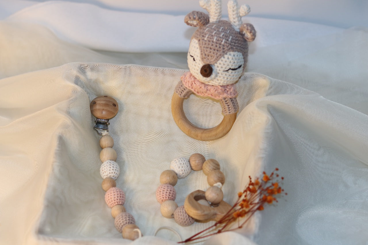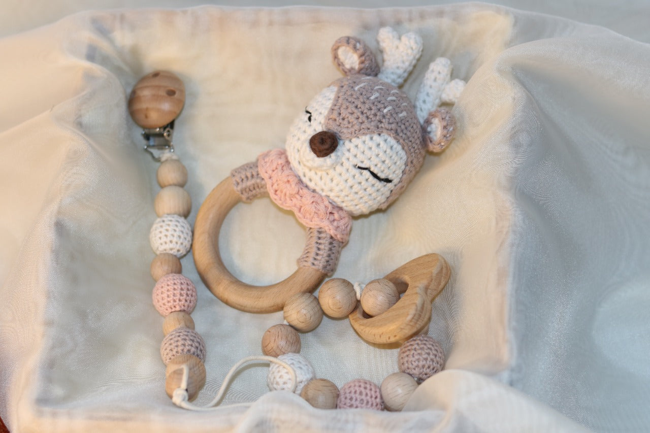 This lovely baby rattle set is is made from 100% cotton and beech wood, and consists of a: