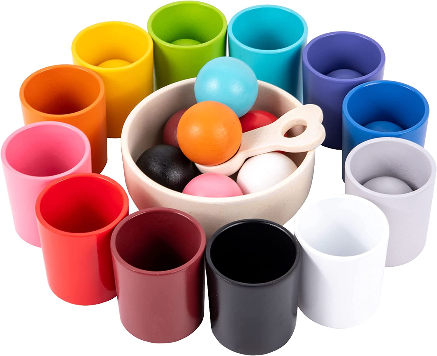 Includes 12 wooden balls, 12 wooden cups, a wooden bowl, a wooden spoon and a linen bag for ball storage and a plywood tray to help to keep everything in order.